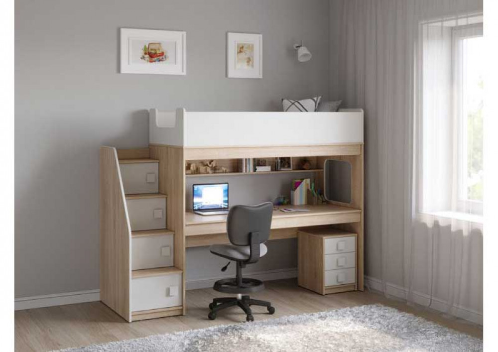 Учебная зона со столом под спальным местом открывает возможности для письменных работ,а также здесь удобно расположить ноутбук, а вместительная тумба поможет в хранеии канцелярских принадлежностей и учебников.
